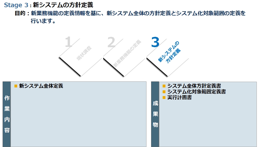 概ね3ヶ月の期間で下記のステップを経て新業務プロセスと新システム全体方針を立案します。